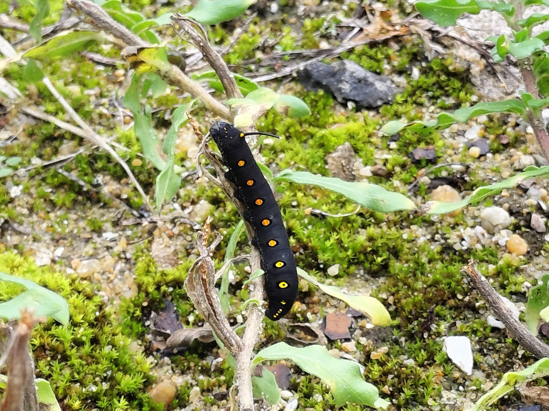 素早い動きをしない虫は近づくことができるのでグーグルカメラで調べると、「セスジスズメ」という蛾の幼虫でした。
